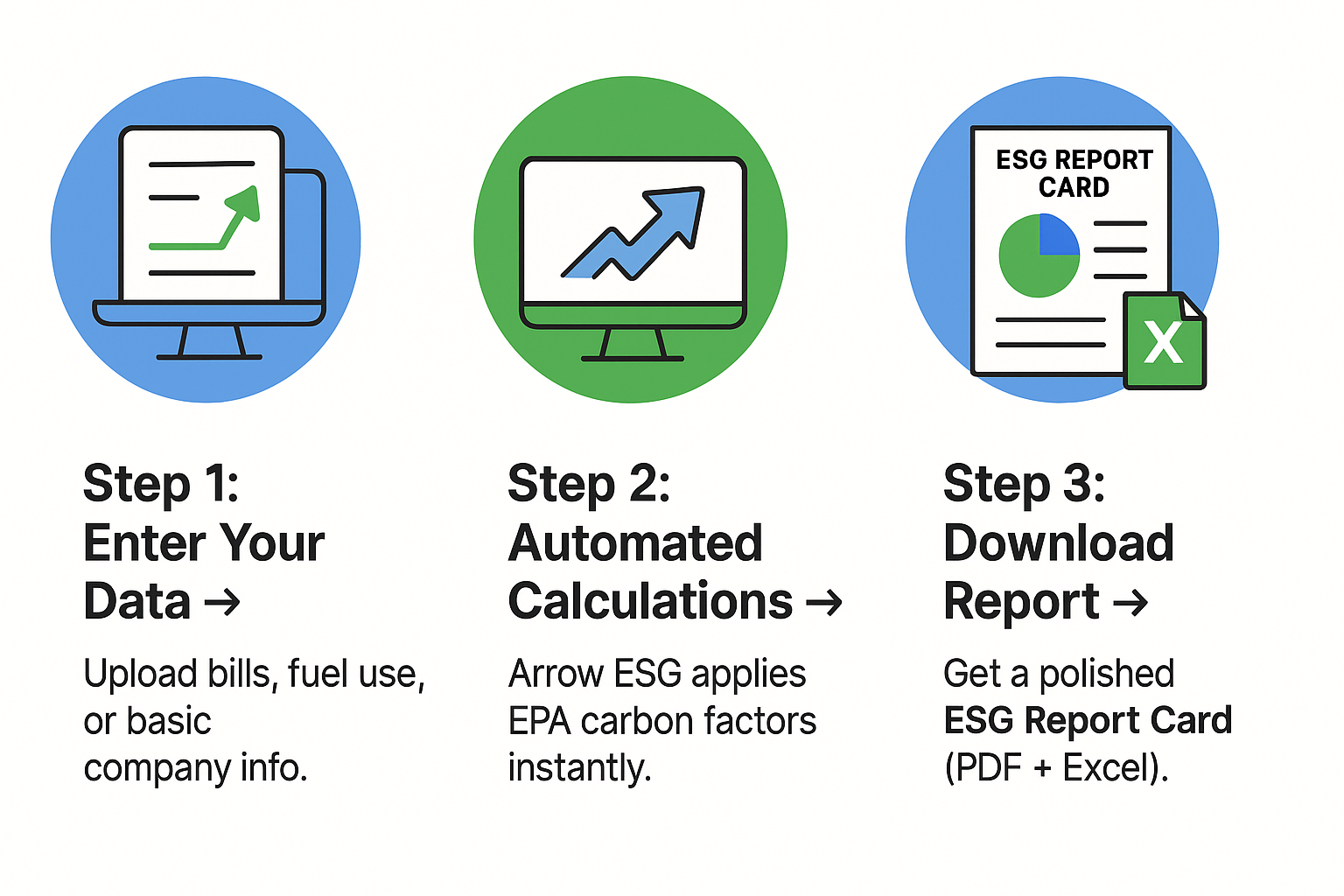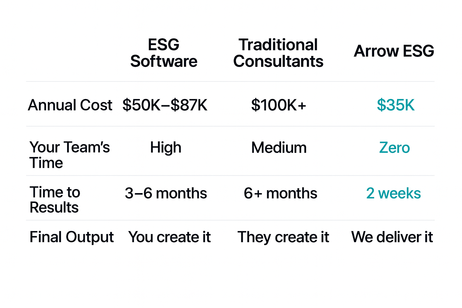 Your biggest customers now require ESG documentation in every RFP. Missing it means automatic disqualification from million-dollar contracts. Traditional consultants take six months and cost $100K+. Arrow ESG delivers the same board-ready reports in two weeks for $35K.